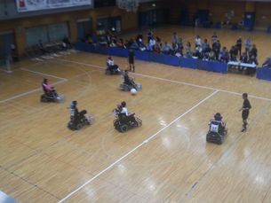 試合も観戦することができました。電動車椅子自体のスピードは速くはありませんが、反動をつけた速いシュートや、先を見越したポジション取り、セットプレーでのサインプレーなど、フットサルと似ていて、観ても大変面白いと思いました。また、大会が多くのボランティアに支えられて、行われていることを改めて実感しました。
