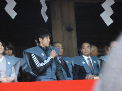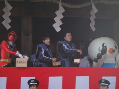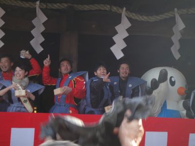 2月3日(金)に府中市の大國魂神社にて、開催されました『府中大國魂神社節分祭』にフットサル男子トップチームより村山竜三選手、田中弥樹選手が参加しました。 節分祭は午後2:00 4:00 6:00 の3回の豆まき式が執行され、アスレの選手は午後2時からの部と4時からの部に参加。拝殿に昇殿をし豆まき役を務めました。 |
