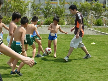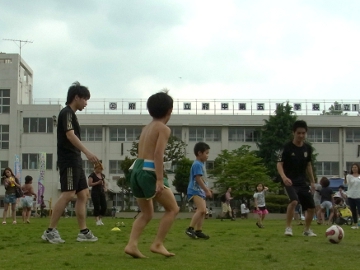 5月22日(日)、府中市立府中第五小学校の校庭にて、第30回わんぱく相撲府中場所が開催されました。 参加者は、中村GM、フットサル男子Topチームから鳩野選手、平川選手、フットサル男子サテライトチームから斎藤選手、そして事務局員の松田の5名です。相撲の出番を終えた小学生を対象に、ゲーム、コーンドリブル、鬼ごっこなどのアトラクションを行いました。 |